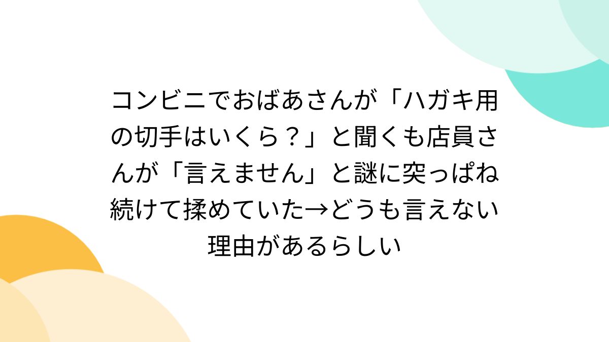 ![コンビニでおばあさんが「ハガキ用の切手はいくら?」と聞くも店員さんが「言えません」と謎に突っぱね続けて揉めていた→どうも言えない理由があるらしい - Togetter [トゥギャッター]](https://i0.wp.com/s.tgstc.com/ogp3/562752cc63c45d4b620d4e139f77365a-1200x675.jpeg?ssl=1)