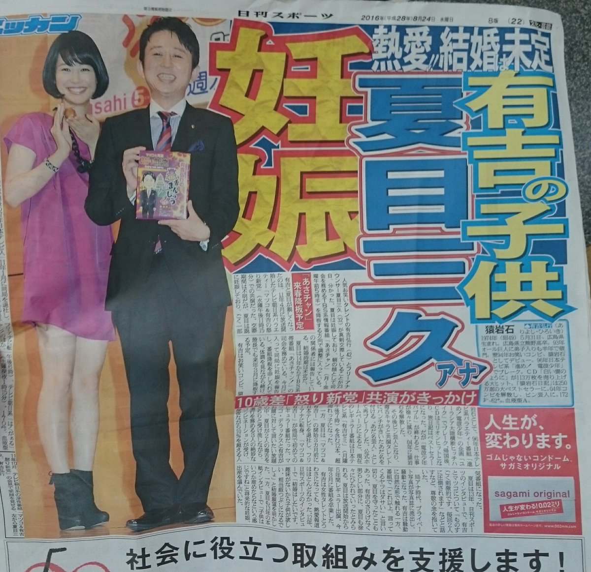 ![夏目三久アナと有吉が交際&妊娠!それを報じるニッカンスポーツの広告欄が確実に意図的! - Togetter [トゥギャッター]](https://i0.wp.com/pbs.twimg.com/media/Cqk6zu5VIAAyfx2.jpg:medium?ssl=1)