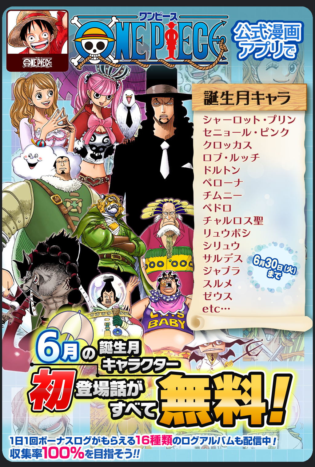 ![ONE PIECE スタッフ【公式】 Official on X: [630(火)まで] 毎日1話以上読める『ONE PIECE』公式漫画アプリで「6月誕生月キャラ特集」開催中! 6月に誕生日を迎えるキャラクターの初登場話が無料で読めるぞ!! ONEPIECEアプリ t.coXZZc8yw31n t.co ...](https://i0.wp.com/pbs.twimg.com/media/EaHYkPoU0AEt0YW.jpg:large?ssl=1)
